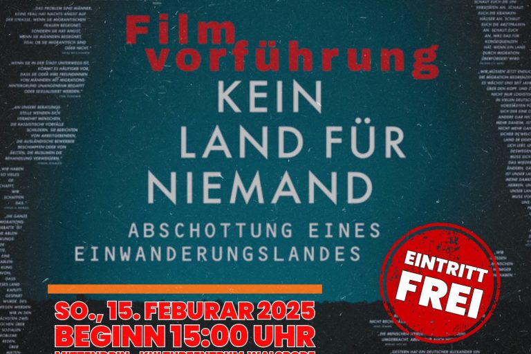 Nach der Ausstellungseröffnung wird um 15:00 Uhr der preisgekrönte Dokumentarfilm „Kein Land für niemand“ gezeigt. Der Film beleuchtet kritisch, wie Migration zunehmend als Bedrohung dargestellt wird und dokumentiert reale Rettungseinsätze im Mittelmeer sowie Pushbacks der libyschen Küstenwache. Die Vorführung findet in Kooperation mit Sea-Eye Hannover statt. Im Anschluss steht Yvonne Marchewitz für Fragen und Austausch bereit. Eintritt frei – Spenden für die zivile Seenotrettung sind willkommen.